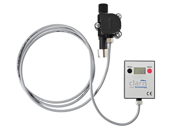 The CLARIS flow sensor was specially developed to monitor water-filtering systems. Once the output capacity of the corresponding filter has been input, the CLARIS flow sensor measures the amount of filtrate produced and shows the capacity still available.